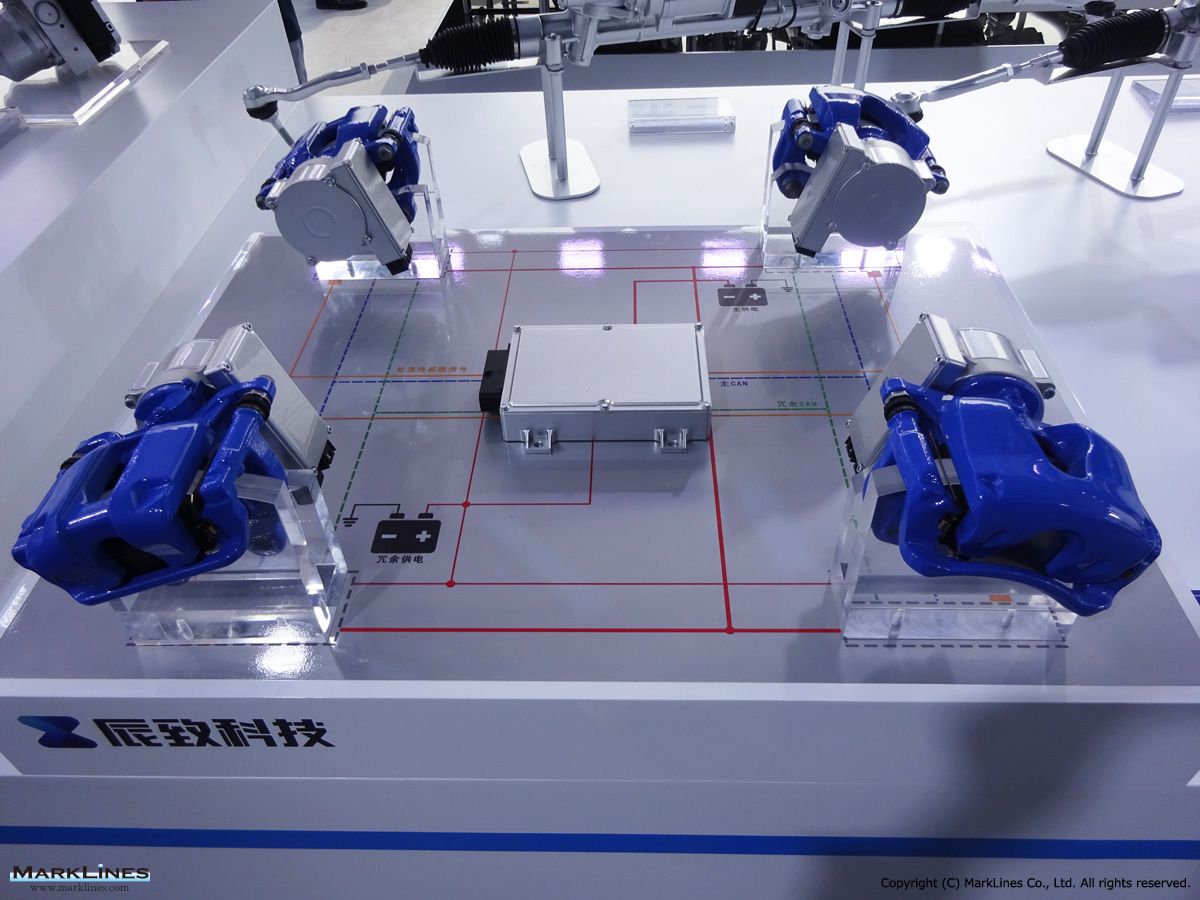 電動機械式ブレーキ(EMB)は高い制動性と応答性の良さから、「究極のブレーキ方式」として注目されている。電気機械式ブレーキはブレーキパッドをローターに押しつける機構を従来の油圧(ブレーキフルード)から電動(モーターとボールねじ)に置き換えた、ブレーキフルードなしで作動するブレーキ。総輪が電気機械式ブレーキとなると、マスターシリンダー、倍力装置、ESC(横滑り防止装置)、ブレーキ配管、フルードなどが不要となり、車両空間の有効利用と車両メンテナンスの負荷低減、コスト低減となる。一方で、パニックブレーキに対応するため、強力なインバーターが必要になり、コストアップ要因となる。