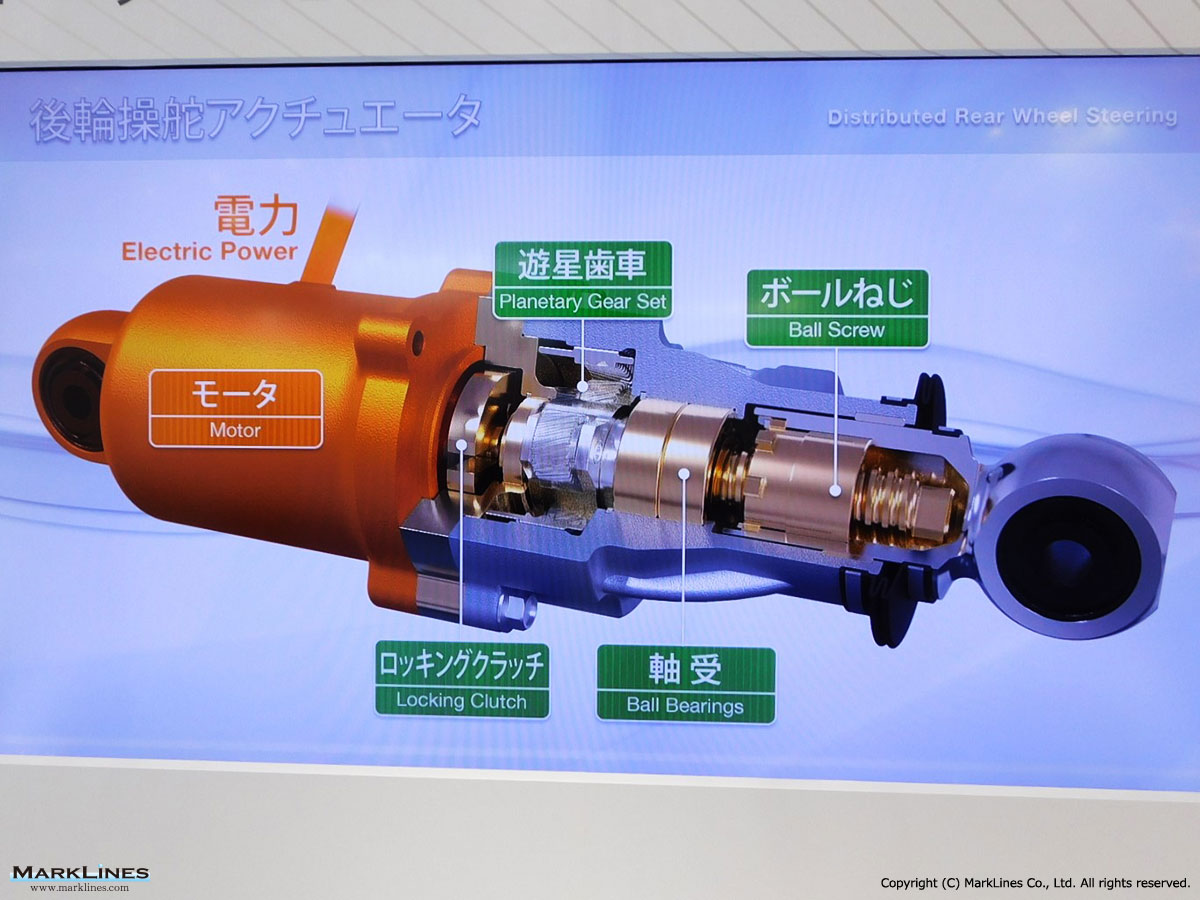 構成例:電動後輪操舵アクチュエーター(モーター、ボールねじ、ロッキングクラッチ、遊星ギア、軸受)